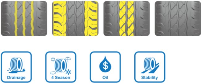 1.Три основные зигзагообразные канавки в сочетании с боковыми блоками обеспечивают превосходную устойчивость при движении и отличное сцепление с дорогой при любых дорожных условиях.