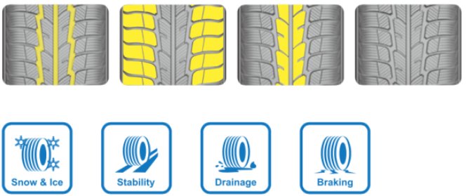 1. Центральная прямая и 2 широкие зигзагообразные окружные канавки с выпуклостями в нижней части улучшают сцепление, сокращают тормозной путь и повышают устойчивость на заснеженной дороге.